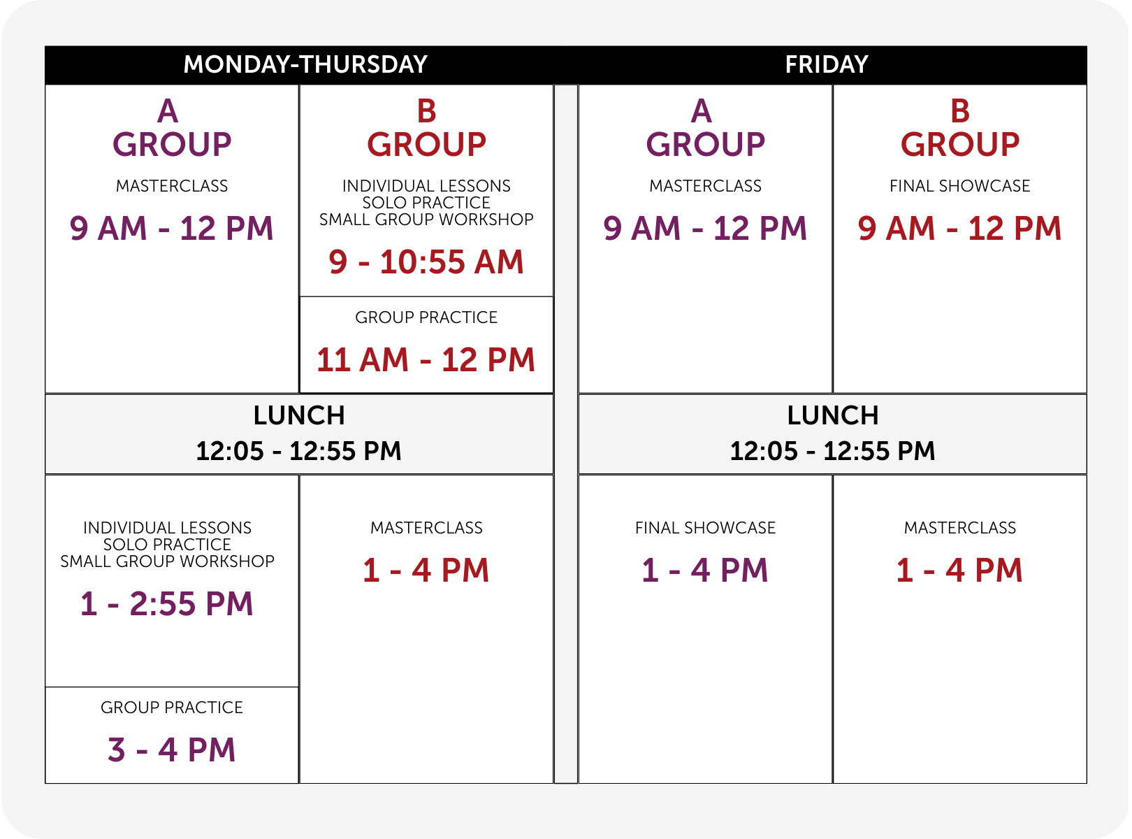 | Full Day Piano Program | 9:00AM – 4:00PM | $995 |